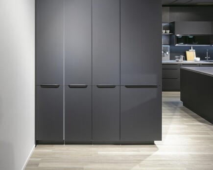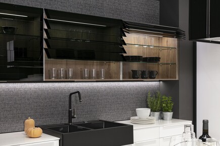 Gepaart mit den darüber angebrachten Glas-Lamellen-Schränken kommt diese elegante Schwarz-Weiß-Gestaltung besonders gut zum Tragen. Wenn es genau solche Küchenideen sind, die Sie sich von Ihrem Küchenstudio wünschen, sind Sie bei uns an der richtigen Adresse!