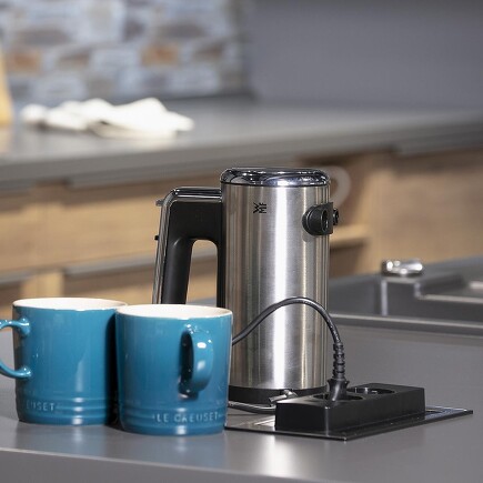 Küchenplanung mit uns bedeutet, dass wir den Stauraum für Elektrokleingeräte genauso im Blick haben wir deren Stromanschluss. Den schaffen wir da, wo er gebraucht wird. Auch direkt in der Arbeitsplatte und auf Wunsch so, dass er bei Nichtgebrauch überhaupt nicht stört.