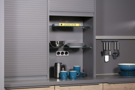 Praktisch, um Küchengeräte und Kochgeschirr, das häufig gebraucht wird, auf der Arbeitsplatte zu haben und trotzdem schnell den Blicken entzogen: Die Rede ist von Rolladenschränken, und zwar solchen, die mit geringer Tiefe als Aufsatzschränke auf der Arbeitsplatte eingebaut werden.