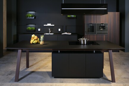 Die in leichter Schräge nach außen gerichteten Tischbeine fallen nicht nur ins Auge, sondern geben dem Kochtisch auch mehr Stabilität. Ideal ist der Einbau eines Induktionskochfelds, weil dieses selbst nicht heiß wird.